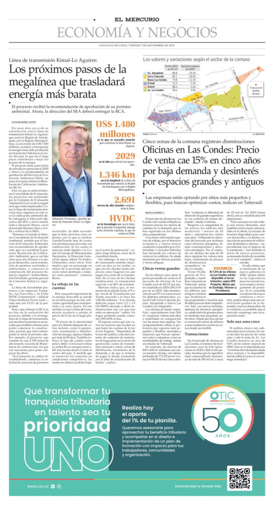 Un paso más cerca de su construcción está la línea de transmisión Kimal-Lo Aguirre, que unirá la Región de Antofagasta con la Región Metropolitana. La inversión de US$ 1.500 millones ayudará a transportar la energía renovable producida en el norte de Chile hacia el centro del país, lo que en el largo plazo contribuirá a bajar los precios de la energía.
