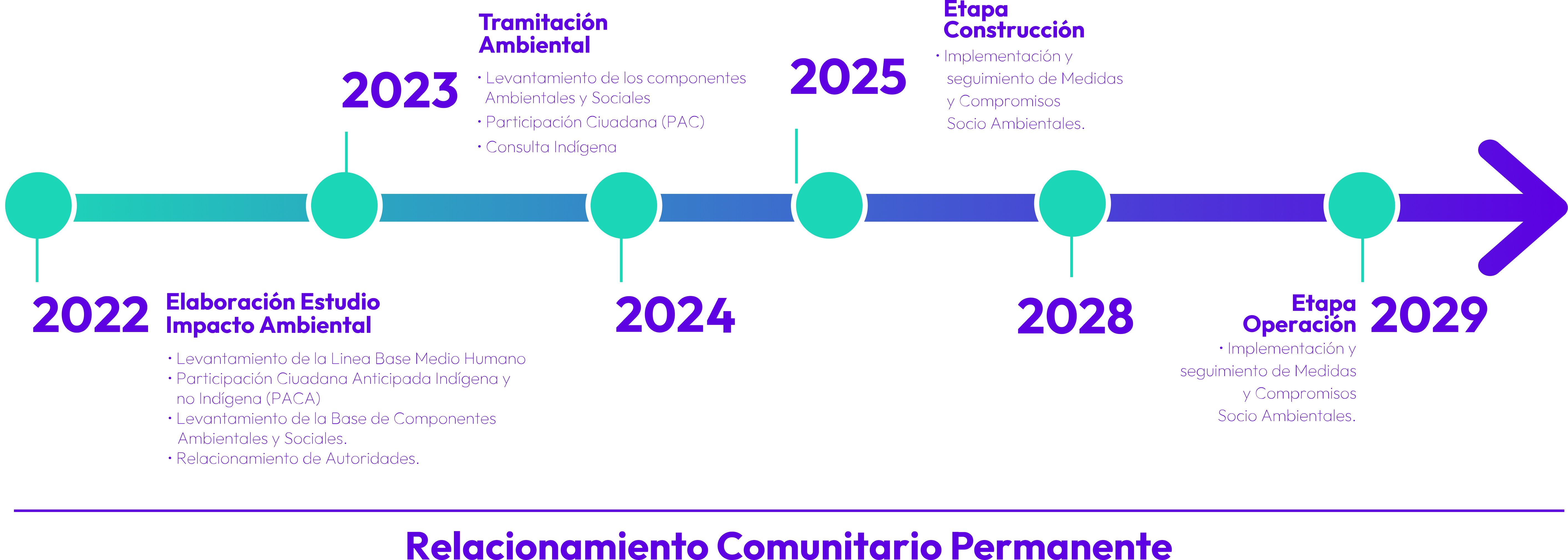 En cuanto al estado actual de nuestro proyecto, cabe destacar que, tras haber ingresado el Estudio de Impacto Ambiental (EIA) al Sistema de Evaluación de Impacto Ambiental (SEIA) en octubre de 2023, el proceso ha concluido exitosamente, dando respuesta exhaustiva a las más de 1.400 observaciones contenidas en el Informe Consolidado de Solicitud de Aclaraciones, Rectificaciones y/o Ampliaciones (ICSARA) Complementario, emitido por el Servicio de Evaluación Ambiental (SEA) en febrero de 2025, así como también a las más de 800 observaciones ciudadanas recibidas a partir del segundo proceso de participación ciudadana (PAC) en abril del mismo año.